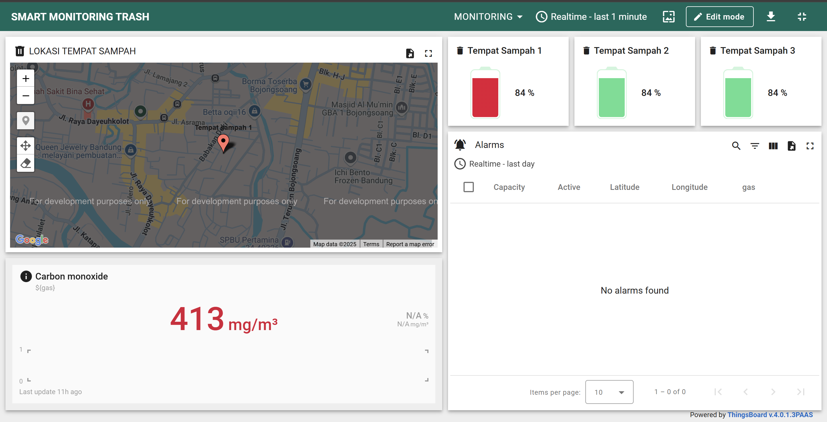 Judul ini diangkat sebagai respons terhadap masih rendahnya perhatian terhadap pengelolaan dan manajemen limbah di wilayah perkotaan, yang berakibat pada berbagai permasalahan lingkungan salah satunya adalah bencana alam banjir yang sangat mengganggu, karena saya dan rekan saya yang notabennya salah satu korban hehe. Oleh karena itu, saya dan rekan saya (pascal) merancang alat/sistem ini untuk sedikit mengurangi dampak tersebut. tidak hanya itu, alat ini dirancang sekaligus untuk memenuhi tugas besar pada salah satu mata kuliah kami, perangkat ini dirancang sebagai solusi berbasis teknologi untuk mendukung sistem Monitoring Tempat Sampah dengan memanfaatkan mikrokontroler unit [ESP8266] yang sering digunakan oleh para pengembang karena fleksible. Alat ini bertujuan untuk memenuhi kebutuhan pemantauan secara real-time melalui integrasi dengan platform Internet of Things (IoT) seperti [ThingsBoard], namun bukan hanya Thingsboard saja, alat yang kami buat dapat diaplikasikan ke berbagai platform IoT lain sperti [ThingSpeak, Blynk, MQTT, maupun Web API dan sejenisnya].